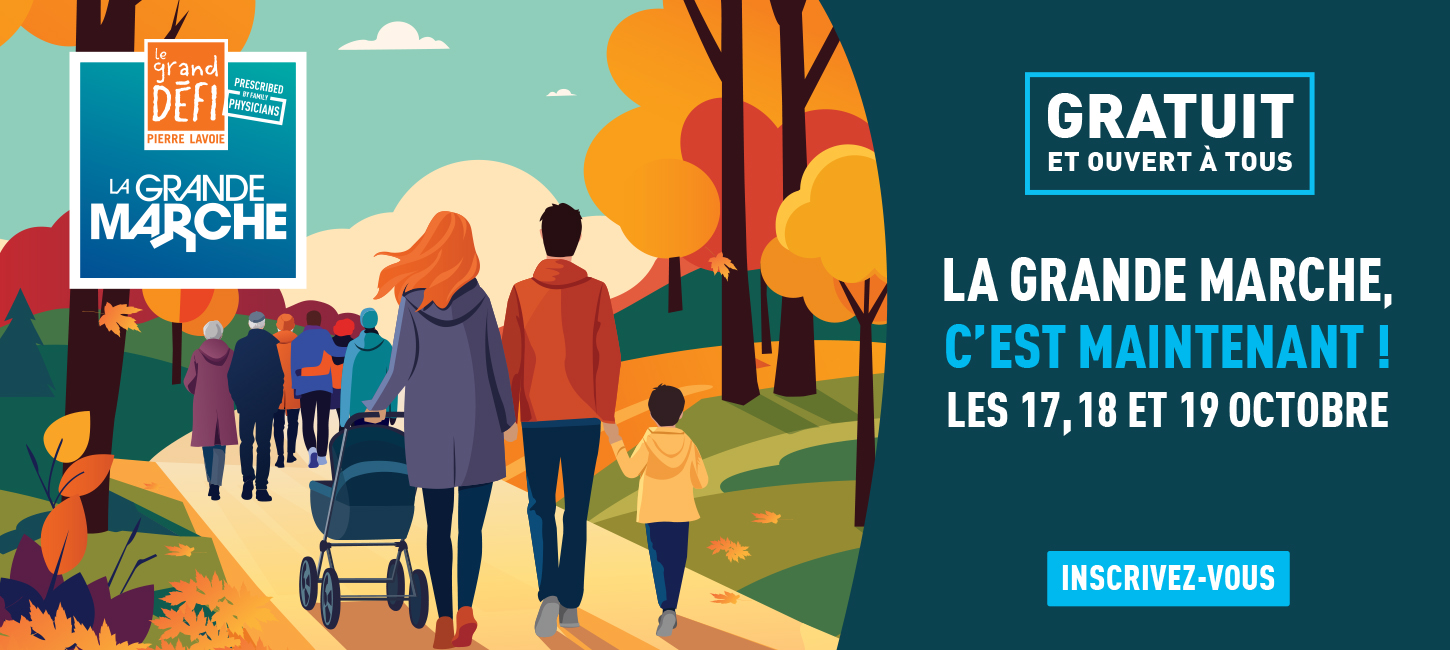 Les 17, 18 et 19 octobre 2025, la Fédération des médecins omnipraticiens du Québec (FMOQ) et le Grand défi Pierre Lavoie vous donnent rendez-vous partout au Québec pour la 11e édition de La Grande marche. Depuis plus d’une décennie, cet événement rassembleur invite les Québécois à bouger ensemble et à faire de la prévention une priorité. Prescrite par les médecins de famille, La Grande marche met de l’avant l’importance de l’activité physique dans le maintien d’une bonne santé et la prévention de plusieurs maladies. Que vous marchiez en ville ou près de chez vous, La Grande marche est accessible à tous et entièrement gratuite. Plus de 100 municipalités accueilleront des parcours de 5 km, et il est aussi possible de participer de la maison, à votre rythme, durant les trois jours de l’événement. En octobre, marchons ensemble pour un Québec plus actif et en meilleure santé!